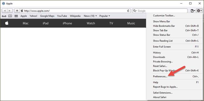 Open Safari. Click the configuration icon (gear) in the upper right-hand corner and then click the Preferences selection.