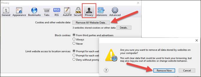 On the screen that appears, click the Privacy header, click the Remove All Website Data button, and then click the Remove Now button. Return to the main Safari screen.