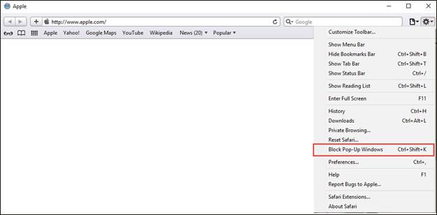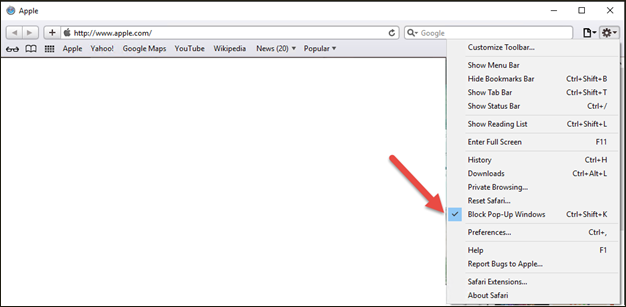 From the main Safari screen, click the configuration icon (gear). From the menu that appears, uncheck the Block Pop-Up Windows selection.