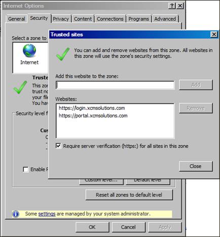*If users first always go to www.xcmsolutions.com, and then use the Client Login link to login to XCM, you may also want to add [first, uncheck Require server verification (https) for all sites in this zone] this URL: