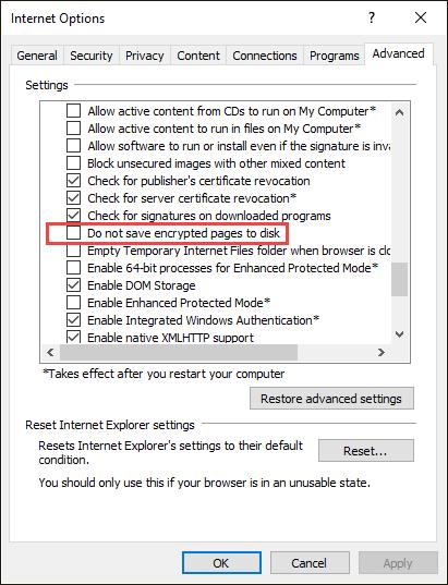 10. From the Advanced tab on the Internet Options screen, in the Settings window, scroll down until you see the following heading. Verify or change its setting by clearing the checkbox next to it (it should not be checked).
