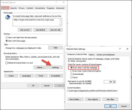 On the General tab of the Internet Options page which appears, click the Settings button. On the Website Data Settings page under Check for new versions of stored pages, click the radio button next to Every time I visit the webpage.