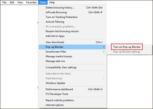 Once the Pop-up Blocker is turned off, the submenu selection changes to Turn on Pop-up Blocker, signifying that Pop-ups are not currently being blocked.