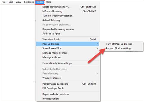 From the main menu, click the Tools header, and then highlight the Pop-up Blocker selection. On the submenu which appears, click Turn off Pop-up Blocker.